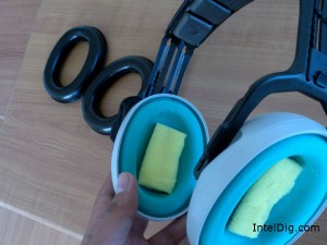 Paso 2 – Recortar un rectángulo de esponja de cocina, de forma que cubra la mayor cantidad de superficie posible del material aislante de los protectores, pero lo suficientemente delgado como para que al poner cada audífono encima, estos no sobresalgan del cintillo protector.