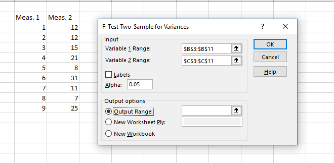 Introduce tus dos conjuntos de datos en los cuadros de rango de entrada. Deja el valor alfa en 0.05 a menos que tengas una razón para cambiarlo. Excel te dará los resultados en una nueva hoja a menos que hayas configurado lo contrario.